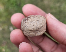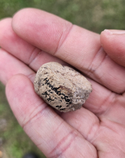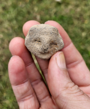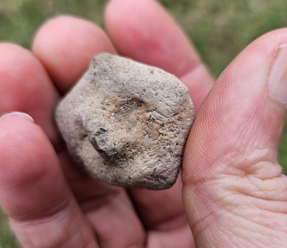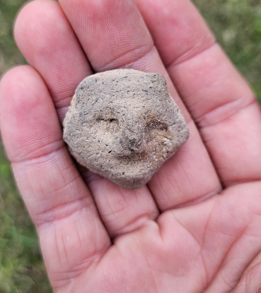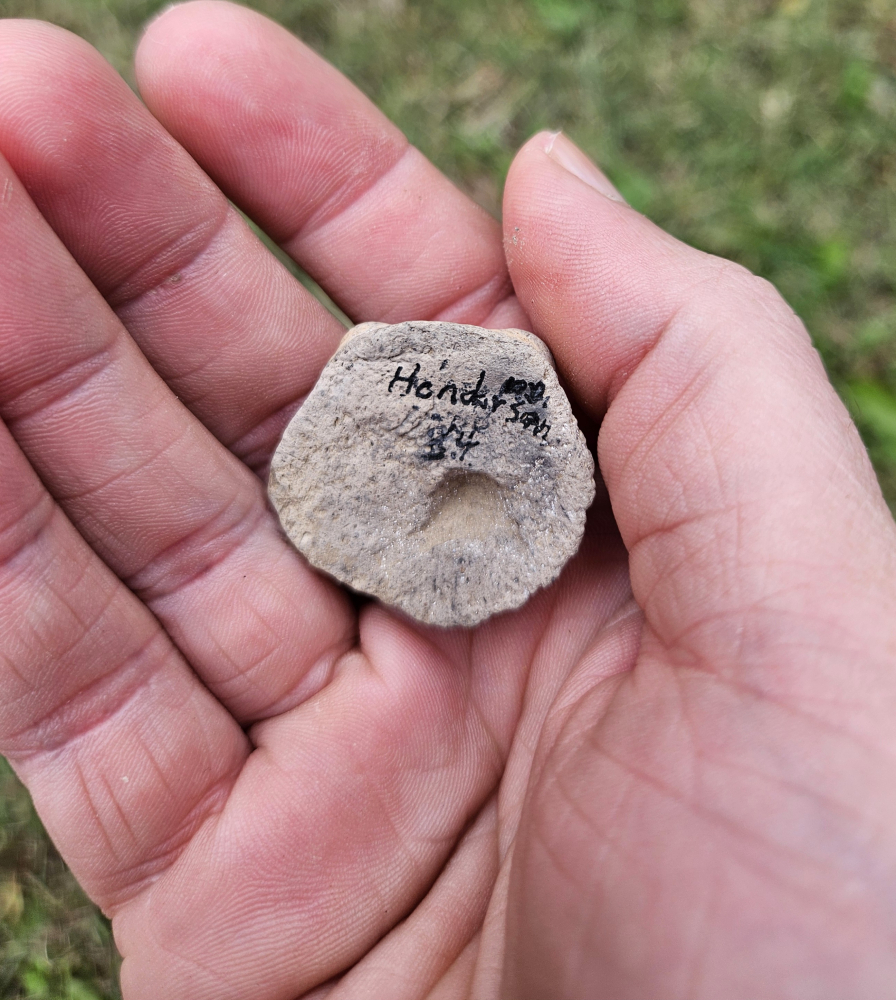 Superb Owl effigy applique rim rider and pottery discoidal game piece, they were found in Henderson County, KY. The owl is an extremely fine and rare piece with some designs in areas. The most unique feature is what I believe to be a fish vertebrae imprint on the back. The un fired clay would have been formed over the bone to help secure it on. Very unique for applique. Measures roughly an inch by an inch. The buyer will receive a bonus piece from the same collection. Don't miss this fine and rare set!