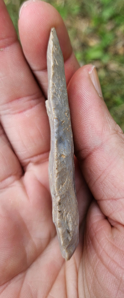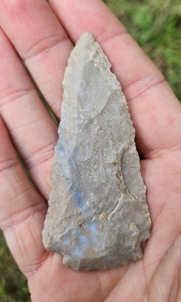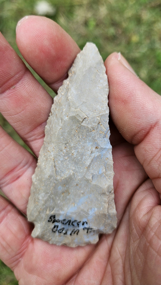 Unique archaic corner notched point from Spencer Co, IN. Likely made from a busted cobbs blade, has some steep basal work with shallow notches for mounting, and great bevels. Measures 2 7/8 inches long. Fine addition for any collection.