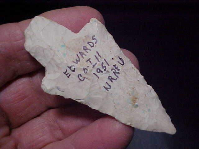 Shipping included on this 1951-found Edwards Co., Illinois, Burlington Chert Dixon--from the private museum of the late Norman Reid--caliper reads between 3&7/8" and 3&15/16" length by 1&7/16" width. The flint knapping is outstanding work, as is the patina--so long as I'm alive it's guaranteed authentic (and I plan to see 100, lol). Payment can only be one of three methods: checks, cash, or money orders. I do not use payment services like paypal--Roy A.