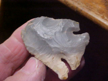 When I was a muuuucch younger collector these Lost Lakes (with the very long barbs) were called "Deep Notches". The name speaks for itself, doesn't it? This Indiana Hornstone-with-cortex Lost Lake is out of the Spencer--Perry County, Indiana, area--length is a 'reduced' (by use and Early Archaic period salvage) 1&15/16". Width is an excellent 1&11/16" and-- to tell you the blade was once much longer--thickness is 3/8" max. When you have that thick of a blade you are assure the hafted knife started out considerably longer. As photographed, there are a couple tiny (yellowed) glue spots--the estate auction had two emptied-out Riker Frames, so my guess is that the point (and others in the small collection) had been 'tacked-in' with glue. The basal edge is heavily ground. Not seeing a steep bevel, I'd say the knife was broken, salvaged, and lost before it'd seen a great deal of use--otherwise the bevel sharpening would have been steeper, the blade more narrow. The close up photo should show how long and ex-curvate the longer barb is, fine, fine knapping. The collection history I have will go to the next owner, provenance matters. Shipping is $8.00 with payment only by one of these three methods: checks, cash, or money orders. I do not use paypal-type payment services--Roy A.
