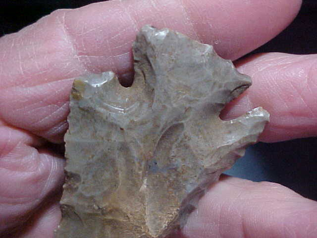 A part of an old (small) Spencer County, Indiana, family collection, this hornstone Lost Lake is 3&1/2" by 1&9/16". The steeply beveled blade is a full 3/8", so you know (based on the sheer number of blade sharpen-and-use cycles) that the hafted knife was once both longer and wider. One barb is salvaged (from use and the sharpening process), it isn't broken, just worn-away--worn in the same way what was likely a sharp tip now shows heavy Early Archaic period use--before the knife was lost. I'll carry that same "worn" label to the ground basal edge--the knife may have been hafted several times, the basal edge slightly altered so it'd fit a handle each time. All that (wear) is part of the 100% guaranteed authentic patina. Hell of a piece, period. $7.00 is the shipping cost. Payment--you have three--and ONLY three options: cash, check, or money order. If none of those three work for you, well, thanks for looking, anyway--Roy A.