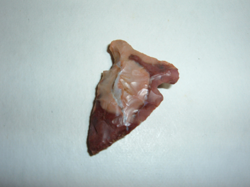 HERE WE HAVE A BEAUTIFUL SUPER COLORFUL EOB C. FOUND IN FAIRFIELD CO.OHIO IT MEASURES 1 1/8" AND IS ILLUSTRATED IN BOB'S BOOK "THE ARTIFACT COLLECTION OFROBERT N. CONVERSE. IT HAS A BEAUTIFUL QUARTZ VEIN RUNNING THROUGH IT ON ONE SIDE, A REALLY DELIGHTFUL,COLRFUL LITTLE POINT!