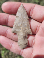 Rare Levanna point from New York. Extremely well pressure flaked on a very rare piece of material known as Ramah chert. Highly translucent and beautiful, minor tip ding keeps it affordable. Measures 1 1/2 inches long.