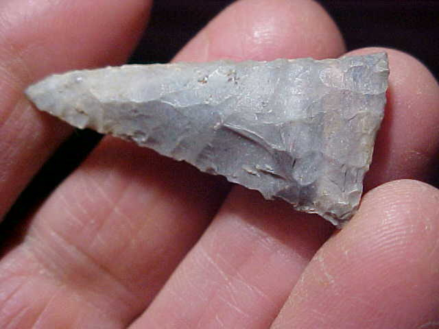 Length of this Indiana Madison point--Mississippian Culture, 1250--1400 common era, is an excellent 1&11/16" by 3/34" width and 3/16" max thickness. It comes from the Vanderburgh County, Indiana, area--once the site of very large Miss. village until something dispersed a thousand people to sites farter west, down the Ohio River in riverbottoms on both sides of the river west of Evansville, Indiana (and Henderson, Kentucky)--you know something more about the area some artifact comes from, you understand more of how it was made, used, and lost. The flint here is kind of a puzzle, it's possibly a nodular flint a knapper found along the river, utilized--it doesn't show the color of Indiana Hornstone or other small deposit local flints. The other possibility I've considered is that the flint was a rock used as a campfire ring, accidental heat altering--the sort of "purplish color" would fit for a flint that had seen heat 'tempering'. Patina is excellent, every detail is guaranteed authentic. Shipping is $8.00, USPS minimum for a small package, and I welcome checks (cash) or M.O.s, but do not use any sort of paypal-type electronic payment--Roy A.