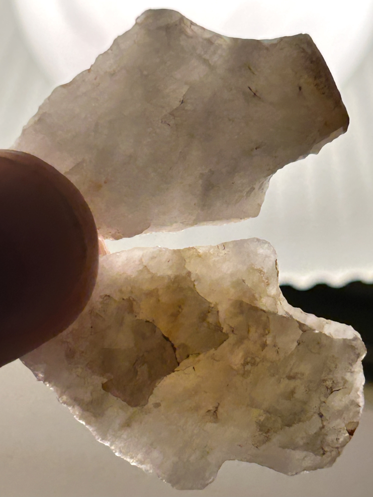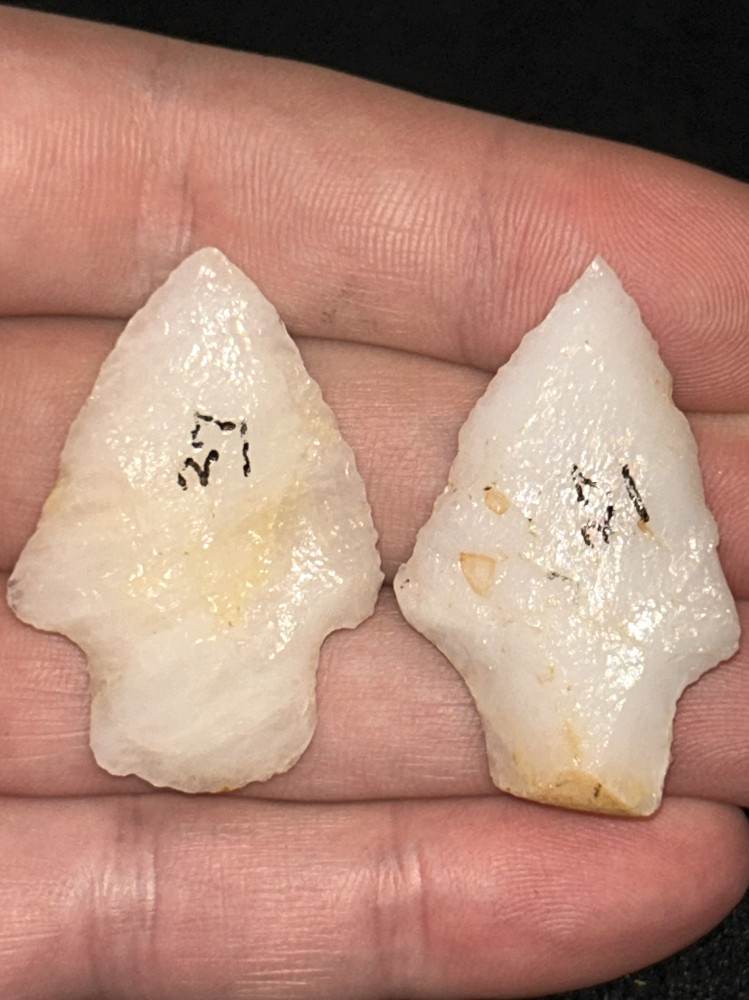A great pair of stemmed points found in northern Alabama. Both are nicely made of translucent milky white quartz. Ex: Billy Wayne Smith collection.