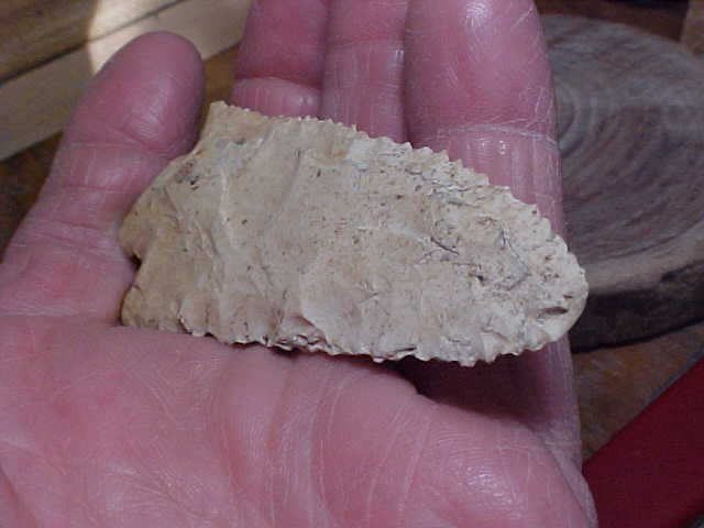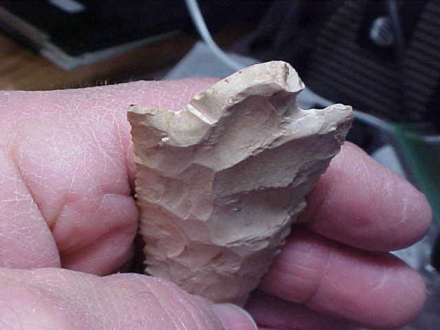 Shipping is included with this Callaway County, MO, Hardin--nice piece of Burlington Chert, even with an Early Archaic salvaged base (stem). Check out the serration on the blade edges, what I view as some pretty decent chipping work. The Hardin stayed in use after the stem break, there is deliberate grinding to smooth the stem before the piece was re-hafted. The tip ding is also ancient, patina, mineral spots, are all over the big (slightly over 3&3/8") blade. I welcome checks, cash, or money orders, but I do not use any sort of electronic payment form (like paypal)--Roy A.