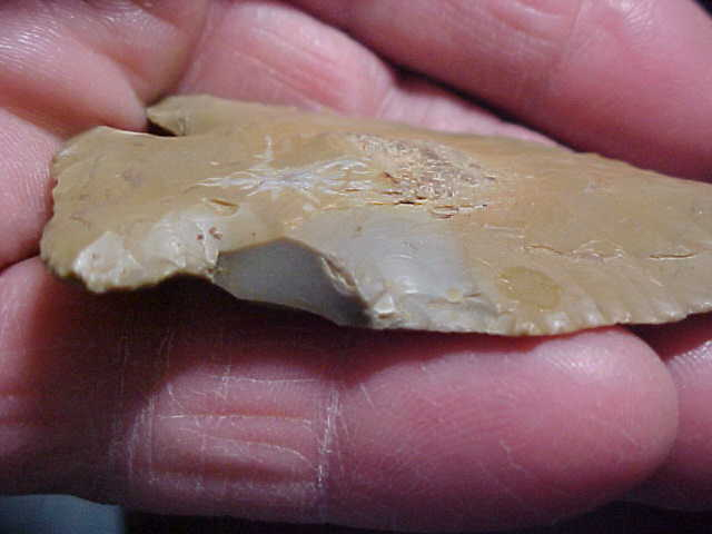 Shipping included on this large Early Archaic Kirk Culture Cornernotch--being Kirk, there is hardly any basal edge grinding...maybe the only way you could distinguish it from a 'barely used' Lost Lake (no bevel sharpening). The piece, Hornstone, is 2&15/16" by almost 1&5/8"--that anciently snapped barb makes it more narrow than the width the knapper first made--and that was close to 2" wide. Big blade, definitely. You can see the shoulder is patinated, but you do see that the flint's color surrounding the break is more brown than the light grey in the break area. That tells me the damage came later than the piece was lost--sometime in the intervening 7500 years, between being lost and being found ten years ago, I'm guessing a deer stepped on the piece--just 'tumbling' in a creek wouldn't break the shoulder that was, it took some 'crush pressure'. Deer use creeks like an interstate highway, I've seen rockbars so churned-up from hooves you wonder how ANY artifact survived. This piece, purchased from the finder (the day after being found) will be sent out with its full history. I welcome checks (cash) or money orders, but do not use paypal-type payment services--Roy A.