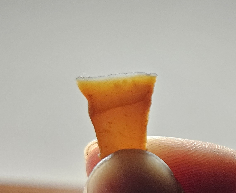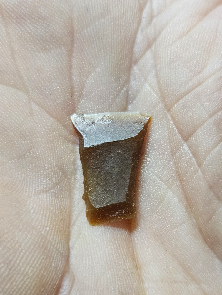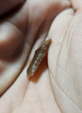 Superb example of a Transverse (tranchet) point from Denmark. These were made from the mesolithic to neolithic. Very unique style of projectile made from blade sections. A few hafted examples have been found in bogs. Material is glorious highly translucent patinated reddish Danish flint. Measures roughly 3/4 inches long. Fantastic addition for your foreign lithics frame!