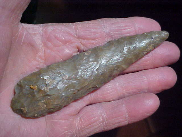 At 4&13/16", there's some size to this Cobbs Triangular. Width is 1&3/16", and next to the base the thickness reaches 9/16"--the blade isn't thin until it reaches the very tip. The long knife is out of the Sullivan/ Knox County, Indiana, area, but that flint is one--because of the creek stain-like patina--is hard to classify--it has some fossil inclusions, the tan spots, and a very good gloss, so if the knife is Attica (as I suspect) it was a higher grade of Attica (Indiana Green). Usually, that flint has a coarser grain, nowhere near this much gloss, but every flint/ chert has differing grades to be found. Note the blade edges on this long, narrow Cobbs, they're very heavily used--this was a hand-held knife that saw long, hard usage...but that also tells you the piece is authentic, that's the trade-off. Shipping is $8.00, checks, cash, or money orders are the only three ways you can pay on my store (sorry, paypal users, I just don't use electronic payments)--Roy A.