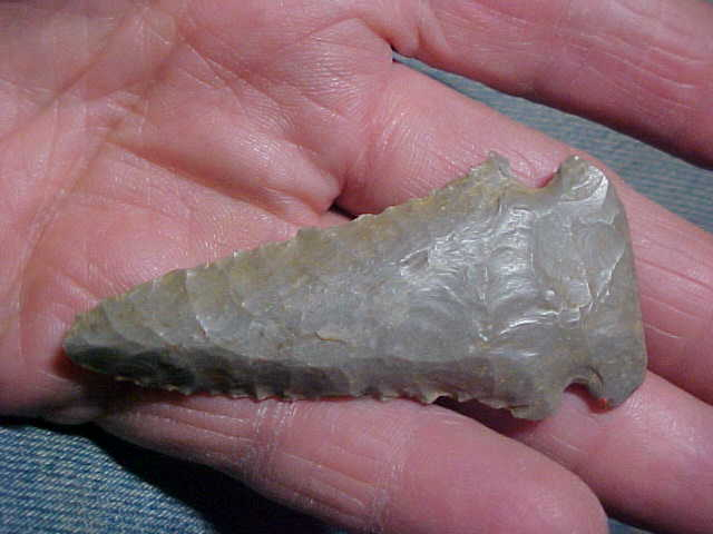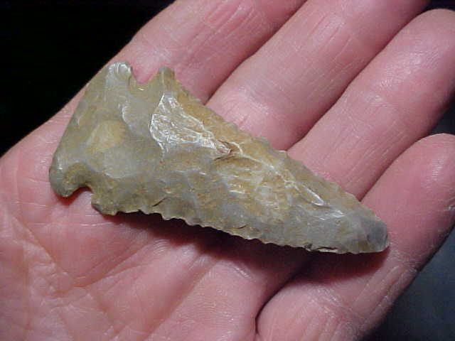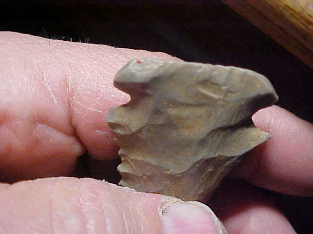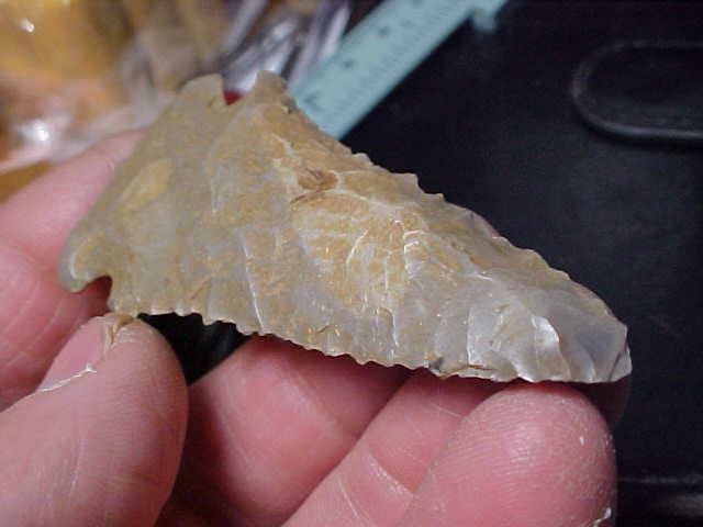 The term (classification) of Fractured Base Dovetail seems to have originated with Red Tully, or at least that was the first use of the term I learned in his book on point typology, but he had extensive point & collecting experience--I still use some of the things I learned from him. If you could listen past his constant 'growl', you learned something--you also learned of his demand for authenticity. I respect that. Okay, this field-found Dovetail comes from a Dubois County, Indiana, farm collection--or at least I assume all the family's points came from their farm--Indiana Hornstone, 2&3/4" by 1&5/16" with a 7/16" thick blade--both faces are fairly flat, heavily, heavily bevel sharpened. One side shows the field soil--wash it if you want, I'll mail-out the piece exactly as I got it--I like the patina this way, I see which side was rain washed, which side was face down. One barb is modern nicked--plow damage as thee isn't patination of the flint (with time). The base shows exceedingly heavy basal edge grinding--and those corner 'fractures' like a Decatur (hence the 'fractured base Dovetail' name). The tip shows a darker hornstone, but whether that means there was some 'later period use', or was there an inclusion of much darker gray flint exposed when the tip underwent Early Archaic sharpening, that's impossible to say. Under a 10x loop you can study the study how the long, flat tip flake starts out weathered, but gets darker as you reach the very tip. To me, that indicates an inclusion in the flint. That's how I judge the color change. The Dove is guaranteed authentic, ancient, in every detail. Shipping is $8.00 with checks or M.O.s how I welcome payments. Please note that this store doesn't use paypal-type payments--Roy A.