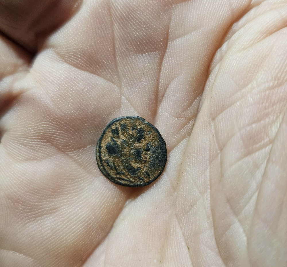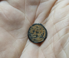 Phoenician bronze coin from Greece. Tyre circa AD 93-195.Turreted and veiled bust of Tyche right, palm behind, traces of murex-shell with Phoenician galley sailing left. Measures 7/16 inches. Very interesting coin from a prominent revered goddess of ancient Greece. She was known as the goddess of fortune.