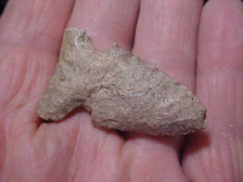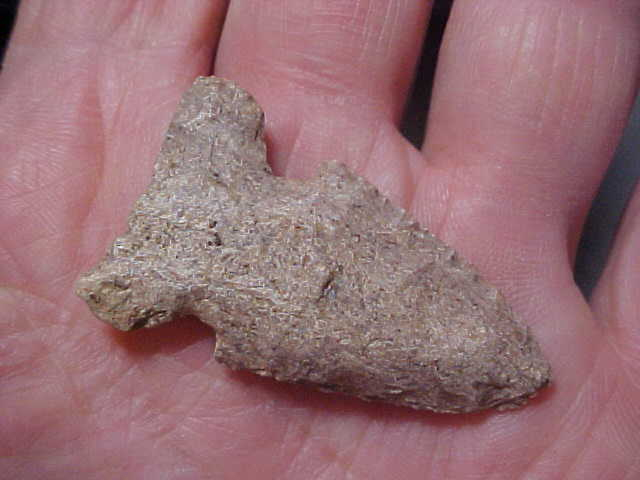 Heavy, heavy basal edge grinding on this Big Sandy, a fossil chert (heat treated as the red color indicates) that measures 1&11/16" by 1". Thickness isn't quite to 5/16", and with a base as wide as this Early archaic point has, there was considerably more blade as the point (knife) was first made. When the piece was sharpened to the present length I would expect it changed to a hafted dart, there not being enough bade length for cutting. There is one small patinated ancient chip at the very tip--or just maybe that was intentional to get a very sharp tip--it IS. The finder hunted up-and-down the Ohio River to the west of Evansville, Indiana--he didn't mark which site (or side of the river) he was hunting, but you have the area where the piece was found--it's real, period. Shipping is $8.00, checks, cash, or money orders are the three ways I welcome payment. Sorry, I do not use paypal-type payment services--Roy A.