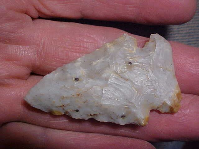 Heavy, heavy basal edge grinding on this Cornernotched Pinetree--Indiana collection, my area, and a form of Chalcedony that's either Spencer County, Indiana, Holland Flint or a close cousin--Ohio collectors will see the similarities to some Flint Ridge Flint/ Chalcedony. A couple things to note: there were multiple sharpenings of the blade on this point--you don't get to a beveled edge with that not being the case. But, with those repeated sharpenings (it's a knife, after all) the barbs and the basal corners also (almost always) reflect minor nicks...use does that. Another feature to point out is that the tip was a burin--under a 10x loop you see the wear-down of the flake ridges--your hands will feel the wear polish as well--not as heavy as that basal edge grinding, but flint wears, it polishes from repeated use. The finder is deceased, so I can't ask if the point is a Vanderburgh County, Indiana, find, or some area county--you now know what I do--his name will go to the next owner, keep the provenance together. Shipping is $8.00 with checks, cash, or money orders the only three ways I take payment. Sorry, paypal users, I do not use electronic payments--Roy A.