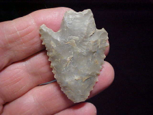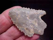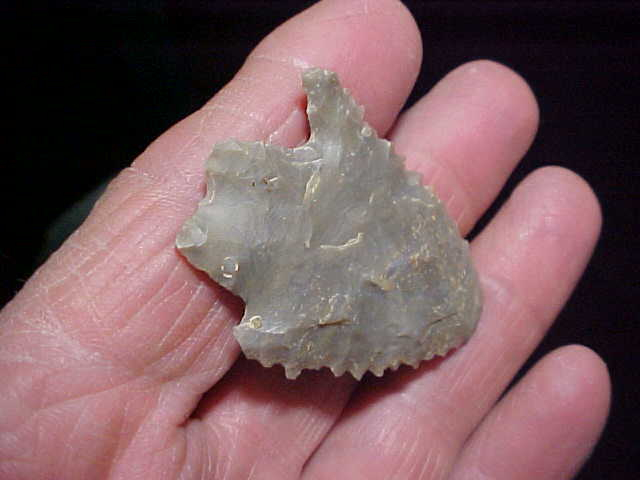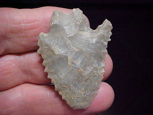 A little dirt on a field find, I generally don't wash the point--just picture it as the finder left the piece (patina)...but when the point is just plain muddy, okay, it's time for a bit of light scrubbing. The piece is from a Vanderburgh County, Indiana, collection--going strictly on the Indiana Harrison County-type hornstone, it's most likely a local find--or possibly in Henderson County, Kentucky, hornstone of that type heavily dominated the flints used in this area. As you move farther west, Early Archaic Culture's "Kirk Culture" knappers might use a different flint source, similar, but slightly different in color. Length is slightly over 1&7/8", that tip nick taking off the length that would have pushed the length over 2". Width is 1&7/16", slightly shortened due to one barb end being dinged. I don't sell used cars, you get a 'damage report' on anything I sell: basic honesty. Now, that bifurcated base, that's some fine, fine workmanship, fluted on both faces, and super thin in the center of the auriculate base--thinning must have been VERY important to the Kirk hunter. So--you see the "before pics" and the "after wash" pics--you see what I see: authenticity. Shipping is $8.00, checks or M.O.s are how I welcome payment. Sorry, I do not use paypal-type payment services--Roy A.