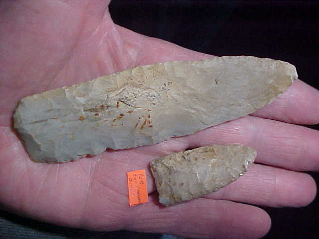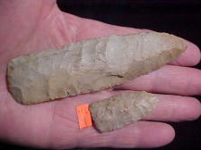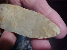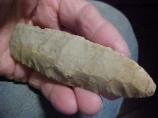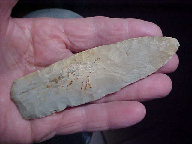 Barely under 4&3/4" by 1&5/16', the medial ridge (max thickness) is a little over 7/16". The piece is from an older collection that was gathered in Perry and then Spencer counties, Indiana. The knife itself shows very long knapping scars which (in places) slide over the medial ridge (outre pas flaking)--is the hand-held knife pre Early Archaic, that is, Paleo, or does the flaking style simply resemble the Paleo knives? What my answer would be might be (or might not be) what someone else thinks...that's what opinions are. That said, the family (collection) DID contain one, only one Paleo point (pictured, for background purposes only--not on the market at this time), and it's a Late Paleo, barely fluted. Are they from the same site--that answer is unknown, but the flint, the variety of Indiana Hornstone, is almost identical--as is the knapping style. Therein, you have my opinion, and what I know of the knife. Examine the pics, ask any question that you think I might be able to answer. I can guarantee the authenticity, but as for classification (culture) it's an opinion based on stylistic characteristics. Shipping is $8.00, checks or M.O.s are the ways I take payments--I do not use any paypal-type payments--Roy A.
