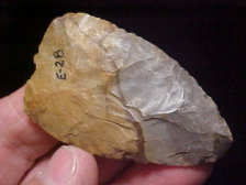 Out of the Spencer--Perry County, Indiana, area of S.W. Indiana--hornstone (as are something like 98% of ALL Turkey Tails), and exactly 3" in length; width is 1&7/16", 3/8" max thickness. A Late Archaic usage resulted in a tip impact fracture, a subsequent salvage (by the 2500 BP hunter), and likely some frustration as the ancient hunter was trying to work his way around that vein of intrusive quartzite--the tip was salvaged, but it looks like the hunter planned on thinning the width to get the sharper tip he was after. The point was lost before that happened. Still, that line of very hard quartz makes the piece 'striking'--you spot it in a frame before any surrounding points. Under a 10x loop the heavy buildup of patina makes this T.T. a "no brainer" authentic point. Shipping is $8.00, checks, cash, or money orders, but I do not use paypal-type payments--Roy A.