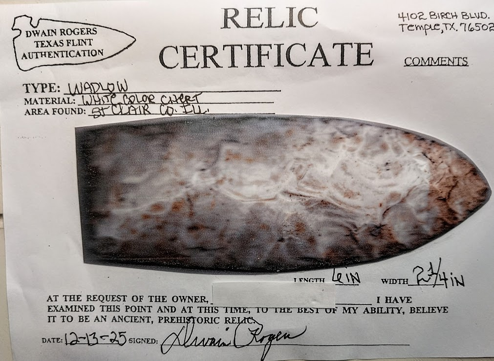 This 6" Burlington chert Wadlow is a real handful! It was found in St. Clair Co., Illinois, and comes with a Dwain Rogers COA. For those of you who like large pieces, this is a real frame filler!