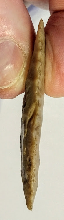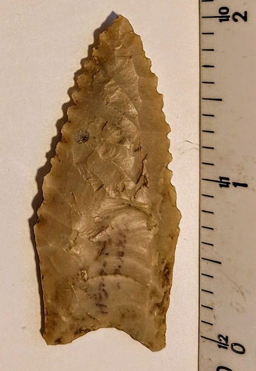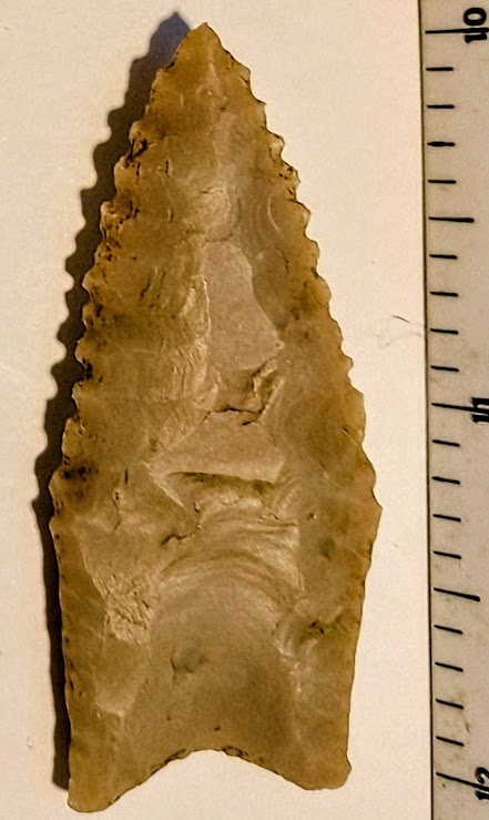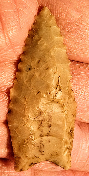 This is a very finely made, serrated, and fluted Dalton point. It was found in Hempstead Co., Arkansas, and comes with a Dwain Rogers COA. It's small, but they don't come much finer than this for a Dalton!.