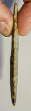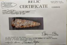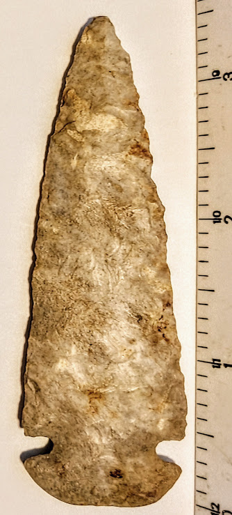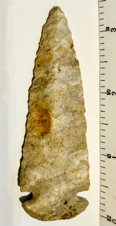 This is a fine example of a Dovetail point, made from Flint Ridge chert, with a ground base. It was found in Fairfield Co., Ohio, and comes with a Dwain Rogers COA. It has good length and color and is a very collectible artifact!