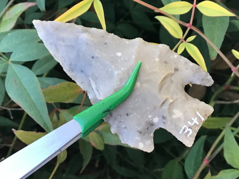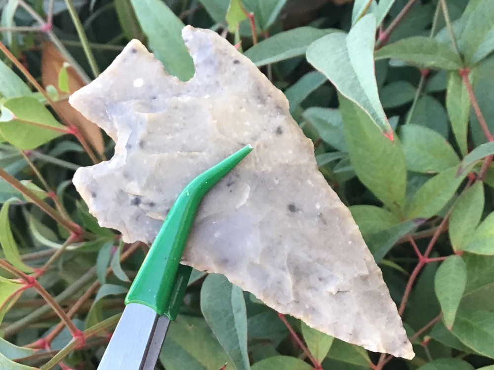 Recovered by Justin Stewart in Kimble County, this Marshall has one shortened barb from ancient resharpening, but is not nicked. It has a fine tip and slightly concave base. I have the shipping and will guarantee authenticity and satisfaction.