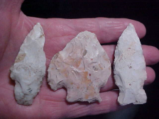 Easy to see the heat treating of the Snyders point in the center of the group--the iron oxides change the 'normally' off-white of the Burlington Chert a 'ruddy' color--you may have a different name for that coloration, but it's instantly recognizable as heat treating. The Snyders shows salvage attempt-after salvage, the Hopewell user found ways (and invented some I'd be hard-pressed to guess)--it worked for their needs--2&5/16" by 2", but still thin, 3/8" max thickness. The stemmed "Steuben" Woodland Culture point is 2&3/4" in length, a black, crunchy mineral build-up on the reverse face--the Adena Dixon is 2&9/16", it's stem edge ground, more heavily sharpened on one blade edge than the opposite side. The Lawrence County, Illinois, finder had some catalog numbers inked-on, but didn't pass along what those numbers indicted--the sites where the pieces were found are likely under a house or highway) now, anyway--a quick aside, one of my favorite sites (a long, low ridge) was used for fill for an interstate overpass. It happens. Three authentic points, real in every detail. Shipping is $8.00, checks or M.O>s welcomed. Sorry, I do not use paypal-type payment systems--Roy A.