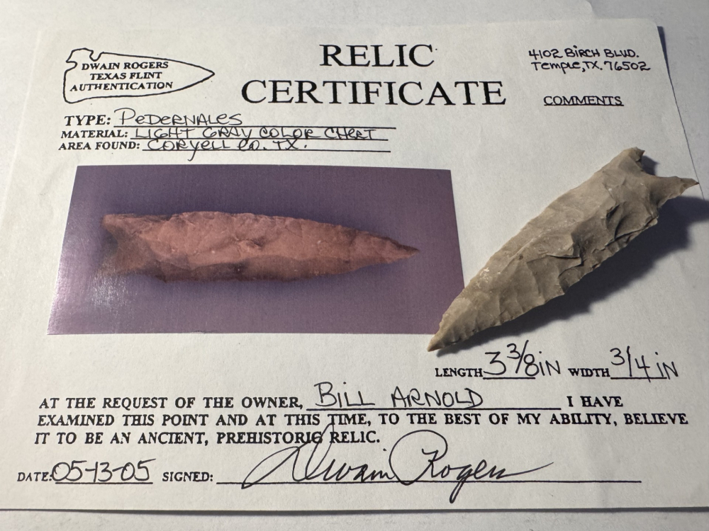 This is a long Pedernales from Coryell County. The edges show use wear with mineral diposits it has a rogers COA