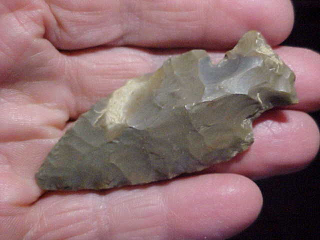 One of those myriad of Hopewell types (Hopewell cluster) from along the Ohio River, Spencer or Perry County, Indiana--length is 2&13/16" by 1&3/16". Being percussion knapped--see the larger, rougher flake scars, the thickness is some 7/17" thick. The point was a hafted knife, not a projectile, obviously--a "Steuben" point style, related to the much thinner Lowe Points of the Late Hopewell--about that time Hopewell (as we call them) were just starting with bow-and-arrow technology, so after this blade style you see much finer worked, much thinner point types--Bakers Creek, Jacks Reef, and finally triangles, true arrowheads. They still had to have hafted knives, so this style likely hung-on for much of the Late Hopewell period--NICE piece of weathered hornstone, REAL. Shipping is $8.00, checks, cash, or M.O.s welcomed, but I do not use paypal-type payment services--Roy A.