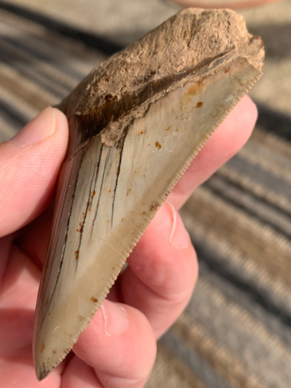 A 3 1/8” heavily Megalodon tooth with bold serrations on it, good blade of tooth also .