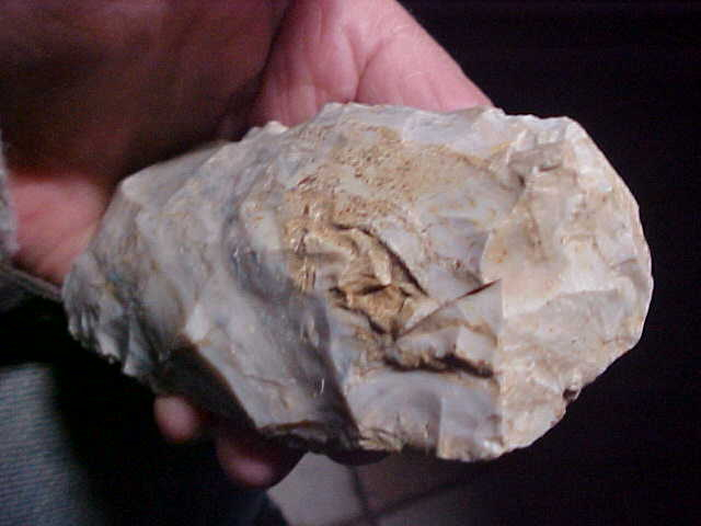 Definitely qualifies as a "colorful piece", this Mozarkite Celt is from a collection on the far western edge of Illinois, St. Claire County. Length is 4&3/4" by nearly 2&1/4", 1" thickness. The bit area shows the wear-down of the knapping ridges--USE, a nd very much thinned on the bit edge. The slanted heel is ground smooth either from use or intentional grinding--so was the piece hafted, or hand-held might only be answered by saying there aren't matching "ground indentions" on either side, dulled spots that'd indicate the use of sinew to attach the piece to a handle. To me that'd mean it was a hand-held Celt/ chopper. That's not a 100% surety, it could be the user wasn't too worried about the sinew abrading as it was lashed tightly to a handle in his opinion. Guaranteed real, period. Shipping is $10-- sorry about shipping cost, but USPS rates and 'zone charges' make shipping a challenge thee days. I welcome payments by checks, cash, or M.O., but I do not use paypal-type services--Roy A.