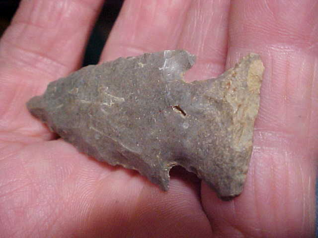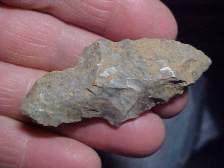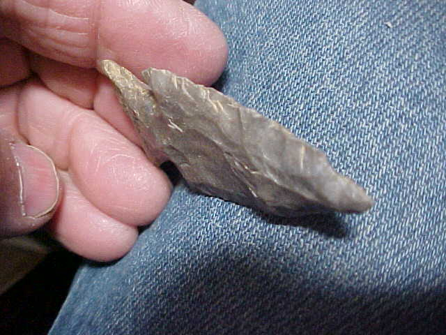 Yeah, that base is a tough 'match up'...no--or so little basal grinding that the piece has to be Late Archaic into Woodland, but not a "true" Motley point base, not a Hamilton, Smithsonia, or any of a half-dozen other point types from that era. In a fashion it's as though the point was a "reconstructed Hardin", but a Hardin would have basal edge grinding. The late B.Wilson found the point in Massac County, Illinois, along the Ohio River--the type hornstone is a western Kentucky material, 2&3/16" by 1", but only a quarter inch max thickness. Note the sharpening technique is Woodland Culture workmanship, percussion flaking, sharpened from each face out to the edge (quadra-facial)--so if that isn't Woodland work, nothing is. Call it a 'variant of a Motley', that's the best classification I can give the piece--but REAL in every detail. Shipping is $8.00 (USPS minimum these days), checks, cash, or M.O.s are welcomed however I do not use paypal-type services--Roy A Oh--one last comment, Go Hoosiers!!!