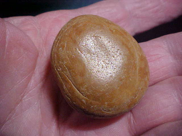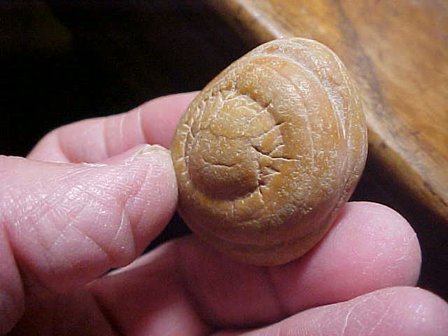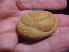 A very small S.W. Indiana collection, a family that picked up about anything 'out-of-the-ordinary' on the small site that was across the road from their Gibson County, Indiana, home. Two cultures were all I saw represented: Hopewell (in very small numbers) and a Mid-to-Late Archaic occupation (Blunts and dart points). One of those two periods of occupation must have found a use for fossils--brought them home. This small (1&1/2" by 7/8") coiled-up fossil (snail or a tiny coiled snake?) had what looks like all the organic material replaced by silicate--quartz. Was it a prehistoric shell dweller', or something else--you might find out with some research, but what any of us would find interesting is that the bottom of the piece shows extensive use polish--that's not a natural polish, it's human made. So--what were the users doing with the stone? Speculation is about all any of us have--personally, I would think it was a leather working tool, the bottom is just too heavily polished for any other use that comes to mind. Neat piece. Shipping is $8.00, checks, cash, or M.O.s welcomed, but please note I do not use paypal-type services--Roy A.