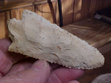 A Dubois County, Indiana, hornstone Dovetail, basal ground, 2&1/4" by 1&5/16", 5/16" max thickness. The piece is out of an old farm collection, the provenance I collected will go to thee next owner, history matters. Every detail is guaranteed authentic. Damage--if you want to call a use-made bit of wear on the very tip 'damage', that's about it. This Dove had only a few sharpenings of the blade, not a great deal of bevel in this stage of Early Archaic use. Shipping is $8.00, and I take payments only by check (cash is fine) or money order. I do not use paypal-type payments--Roy A.