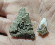 Very rare pair of points from Hokkaido Japan. Made made by Japan's oldest culture, the Jomon period. Extremely old at around 13 to 14 thousand years. The largest piece is made of a fine grained sanukite and the tip is made from chalcedony. Largest measures 1 inch long. Great opportunity to own a piece of ancient Japanese technology! The tip on the larger piece has a nifty little spokeshave flaked in. Highly recommend this lot!