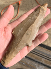 A 2 3/8” Kirk corner notch point, made of a tan gray colored fort Payne Chert, this example was found in
