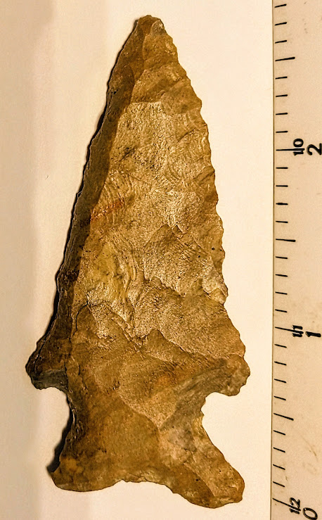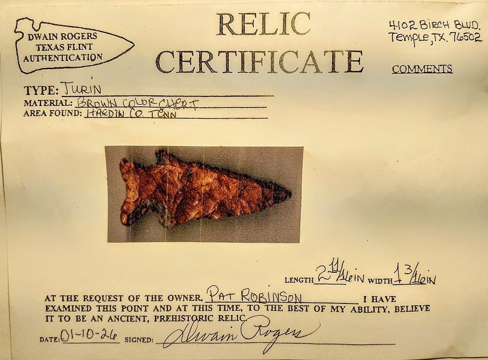 This well-made, beveled Turin point is a great artifact for all you type-collectors. It's made from a fossiliferous chert and was found in Hardin Co., Tennessee. It comes with a Dwain Rogers COA. Turin points that are this well-made are hard to come by.