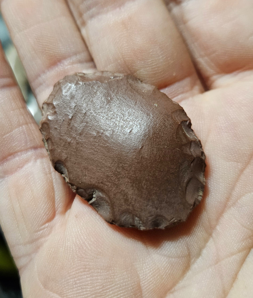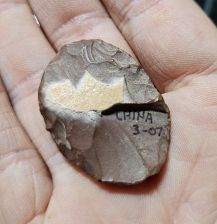 Very rare ovoid scraper from China. Made my a culture known as the ordos that lived many thousands of years ago. Made of very nice reddish chert with lots of use wear. Measures 1 1/2 inches long. A great starter for your foreign frame!
