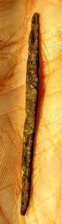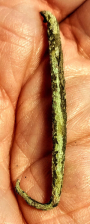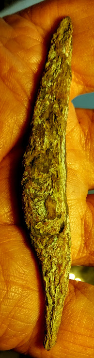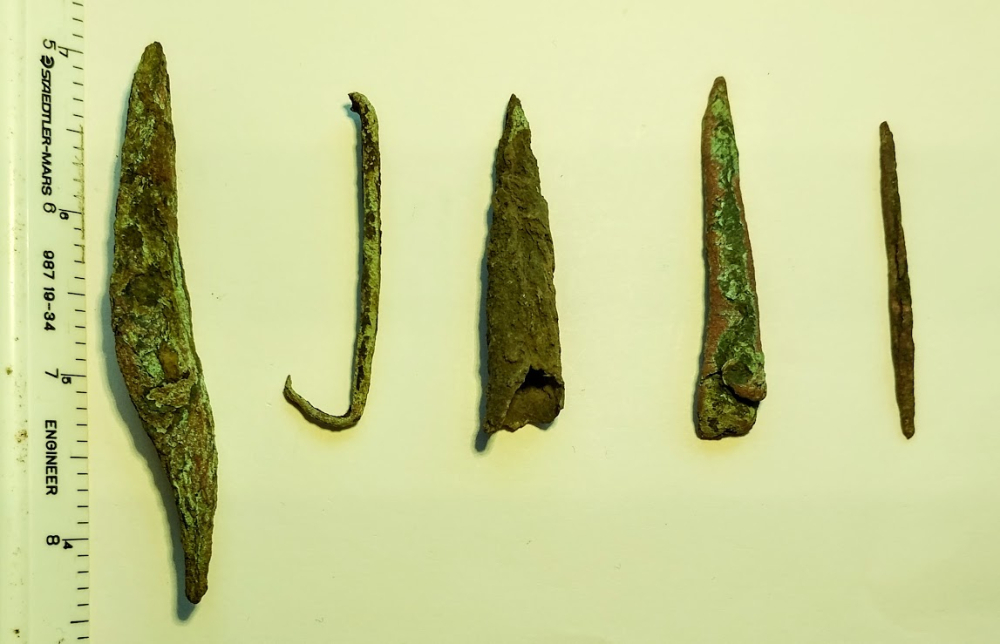 This is a great group of Old Copper Culture (OCC) artifacts that Native Americans shaped from native copper or "float copper" found on the Upper Peninsula of Michigan. This grouping includes a large knife, a fantastic fishhook, two projectile points, and an awl. These artifacts were found in Delta Co., Michigan.