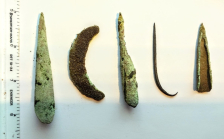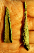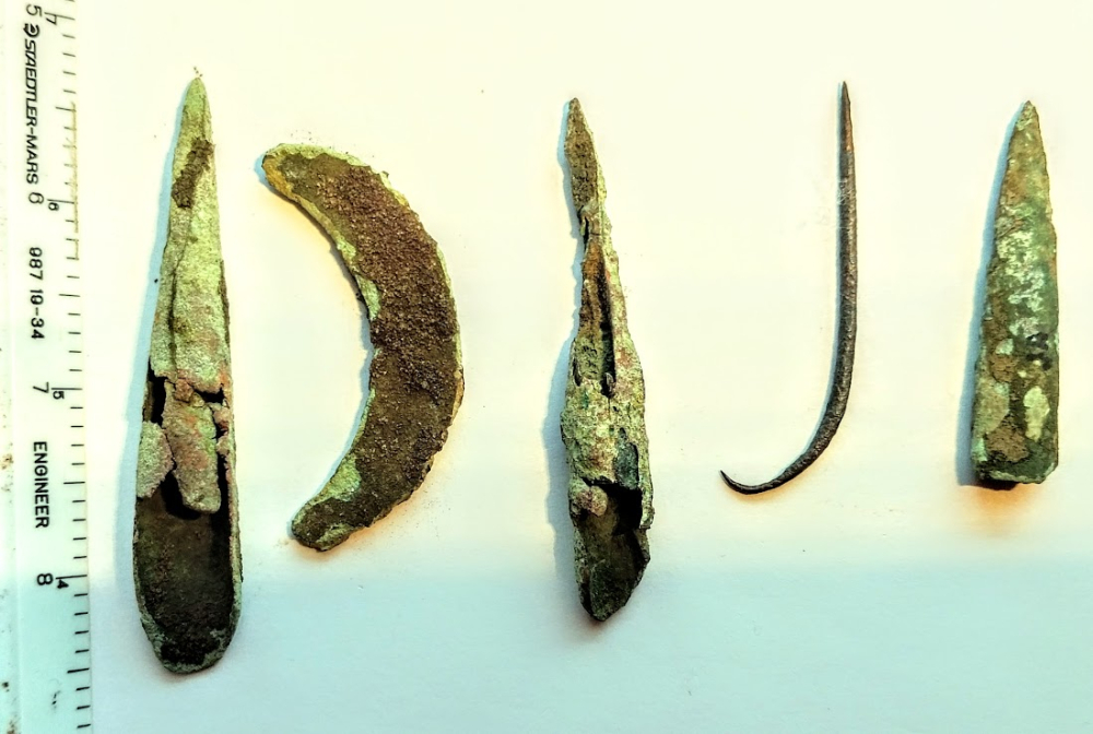 This is a great group of Old Copper Culture (OCC) artifacts that Native Americans shaped from native copper or "float copper" found on the Upper Peninsula of Michigan. This grouping includes a Crescent Knife, a fantastic fishhook, and three rolled projectile points. These artifacts were found in Delta Co., Michigan.