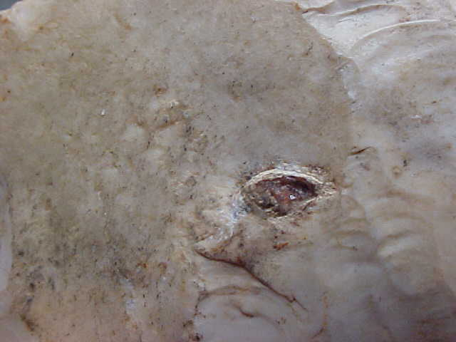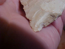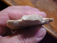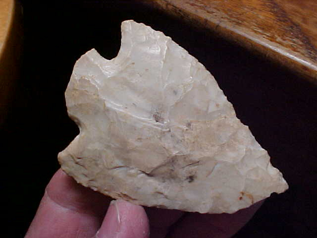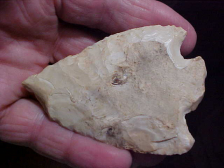 An extra large Snyders point that came from a S.W. Indiana collection--it could have been found here in Indiana, or across the Wabash River in Illinois--this is a Hopewell (Snyders Point), and those Woodland Era people were constantly trading to get out-of-area flints (or material for their tools). Length is 3&1/16" by a wide 2&3/16", only 3/8" max thickness--now is the chert Burlington, or something tan that looks similar--see the small inclusion in the center of the 'flatter face'--there is a 'faceted' crystal in that inclusion, almost a garnet-colored red. I've never seen an inclusion of that sort in Burlington, so I'm of the opinion this is some other chert. Flint sources, though, I've walked a number of them searching for color variations--just when you think you know every color of a chert, pop, there's a piece that surprises you--you're always learning (hopefully). This big Snyders, you can see salvage and subsequent work patterns on the tip (see one small modern chip, it shows bright white in the indented tip area)--the stem, the basal fracturing, I doubt there ever was more to the stem--too thick for one thing, it'd seem the Hopewell knapper worked the stem last, he got the blade length he was after, the wide barbs, but then ran out of preform to fashion a 'proper' Snyders stem--a lot of what we call "snap base" points are like that, not broken, but made to get as much usable blade length as possible. Nice Snyders, guaranteed authentic in every detail. Shipping is $8.00 with checks or M.O>s welcomed. My store does not use paypal, though--Roy A.