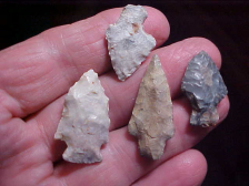 The price includes the $8.00 it'll cost to ship this group of Gibson/ Posey County, Indiana, points--just decent points that are 100% authentic (and made of good flints). The stemmed point is the longest at 1&3/8"--it's somewhere between a hornstone and a river pebble that was put into service. The white/ tan Cornernotch is Early Archaic Culture, heat-treated flint, a nicely ground basal edge--not quite to 1&1/4". The final two are somewhere between 'stemmed' and Motley-based--seem to actually be the same flint when you study the colors seen in each one--nice "Birdpoints", REAL. I welcome checks, cash, or M.O.s, but I do not use paypal-type payment services--Roy A.