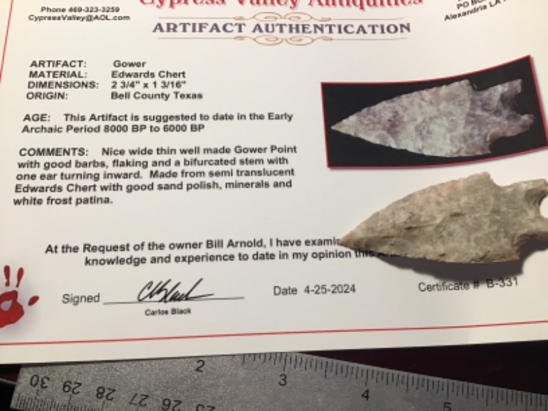 This Gower is well patinated with lateral edges showing heavy use wear and bifurcated stem. One ear turns inward and comes with a Carlos Black coa. I have the shipping.