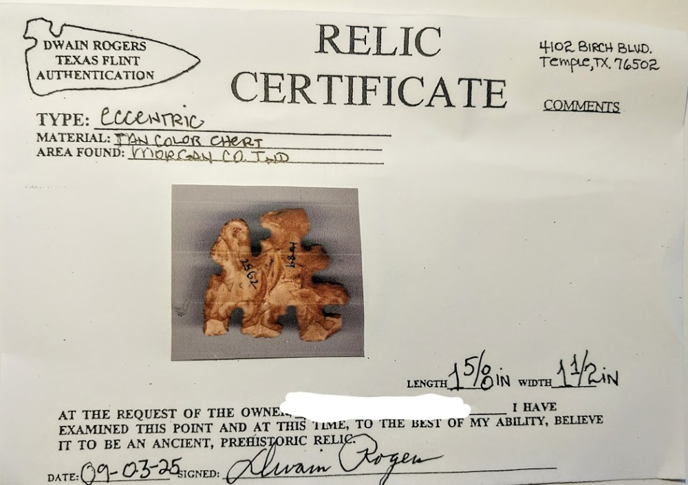A very unique Eccentric Artifact for those who enjoy the unusual. It was found in Morgan Co., Indiana, and comes with a Dwain Rogers COA. It looks like an elaborate jig-saw puzzle piece make from flint!