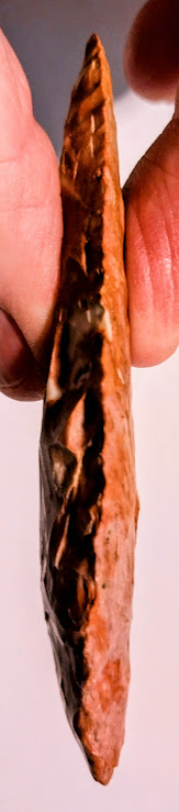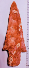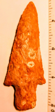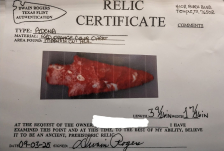 This beautiful Adena point is made from a reddish-purple, fossiliferous chert. It was found in Marion Co., Alabama, and comes with a Dwain Rogers COA. It is likely an Adena Robbins variety.