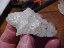 A Sangamon County, Illinois, Dixon, a glossy Crescent Quarry Chert,2&1/4" by 1&5/16", only 1/4" MAX thickness. The blade shows a number of ancient sharpenings, but still a well made blade and great barbs. Note the stem is practically serrated--not by accident, some Woodland knapper wanted to make sure his handle bindings didn't slip--I've seen countless stemmed points, but never noticed a stem with "grip-tight" serrations. Makes sense. Great patina, but there is a small ding (use made) on the very tip. Guaranteed real, period. Shipping is $7.00, checks, cash, or M.O>s are welcomed, but I do not use paypal-type payment services--Roy A.