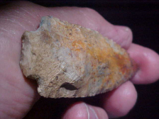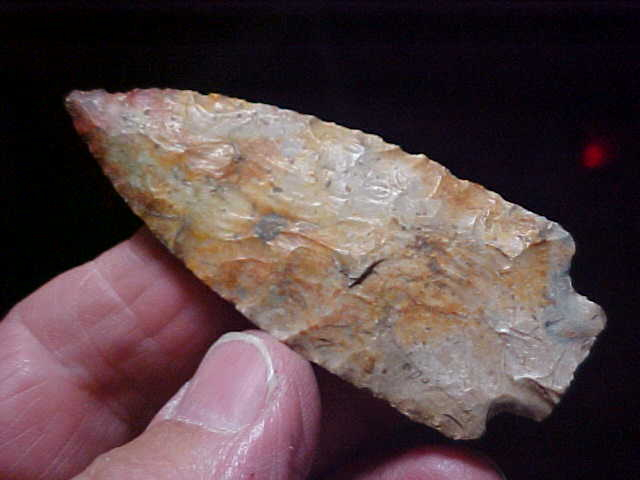 JUSTIN--the email address you have on file has a problem/ mistake, I can not get an email to you--please click "Ask seller a question" with a different email address. Thanks--Roy Autry A Vigo County, Indiana, blade I've held onto, the color alone is so remarkable. Whether it was an Adena base, or a straight stemmed Late Archaic point, that one I'm unable to answer, but the thinness 5/16" max), I hold out that the piece is in the Archaic time frame, not Woodland. Length of the fossil chert blade is 2&13/16" by 1&1/8"--creek minerals changed the color, brought out iron in the chert. One note--it looks like the piece was longer before ancient salvage--it's like they forced a stem on what was a very long blade that had broken, returned the knife to service. Real, period. Shipping is $7.00, checks, cash, or money orders are the only ways I take payment--I do not use paypal-type payment services--Roy A.