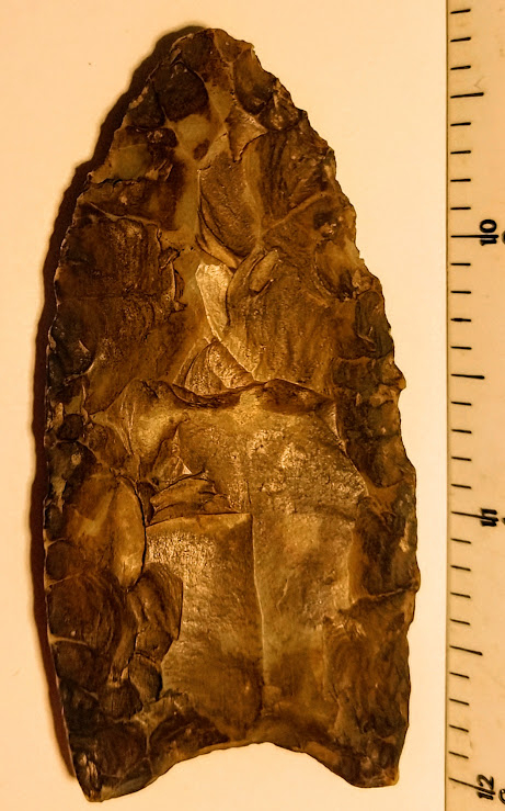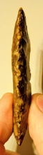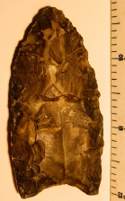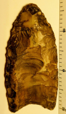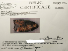 This stunning Clovis with beautiful flutes is made from attractive mottled, brown flint. It was found in Christian Co., Kentucky, and comes with a Dwain Rogers COA. It was formerly in the collection of Raymond Vietzen.