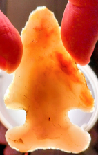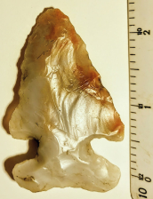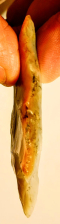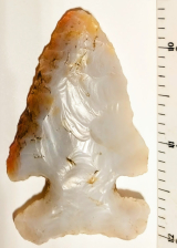 This beautiful Thebes point is made out of colorful, semi-translucent Flint Ridge chert. It was found in Miami Co., Ohio, and comes with a Dwain Rogers COA. They don't come much prettier than this!