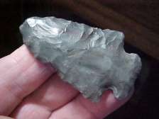 A Sangamon County, Illinois, Adena made from a well fired Burlington Chert--the iron oxides ''pop" (appear) when Burlington was buried under a layer of ash-clay-- and wood, then heated for hours. The raw white flint took on a gloss and a 'knappability' that raw chert didn't have--like forging a steel knife. This Adena measures nearly 2&5/8" by 1&1/4", but never quite makes it to 3/8" max thickness. The stem edges may have very slight dulling--not enough that I'd call the stem 'ground'--just dulled. There is no obvious damage to mention, although I think the Adena hunter had a 'stack' in the flint at one shoulder that caused some knapping difficulty. Nice point, REAL. Shipping is $7.00 with checks, cash, or M.O>s welcomed. Sorry, I do not use paypal-type payment forms--Roy A.