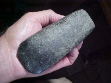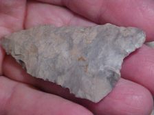 Shipping comes with the price on this hornstone creek find from the Daviess County, Kentucky, area (could be Ohio County, depending on the particular creek they were hunting that day)--a piece I've had in my collection for over fifteen years. An ancient break on a basal tang of the Nuckolls Variety Dalton aside, the flaking is absolutely great, the serrations formed by the oblique/ diagonal flaking technique. Length is 2&9/16" by 1&5/16", 5/16" is the max thickness--symmetrical. Both faces show basal thinning that's equivalent to fluting (just not as deep), and what remains of the basal edge shows grinding. The finder is an old friend--read that as my having more than 100% confidence the point is real--John knows flint, first introduced me to creek finds some twenty+ years back. Note that on the dished-in basal tang there is strong polishing of the damage--that allowed continued use of a fine VERY Early Archaic point--the DAlton hunter also salvaged a tip-edge nick, formed it as a slight bevel (see photo). I welcome payments by check, cash, or M.O., but do not use paypal-type electronic payments--Roy A.