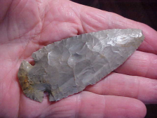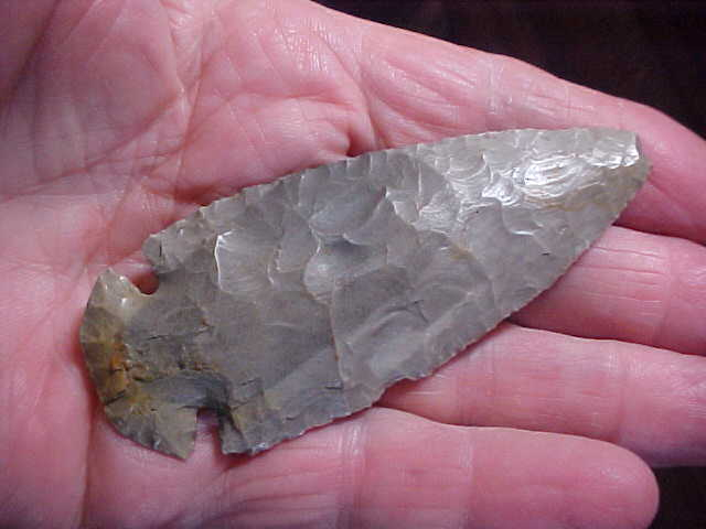 My caliper reads on the 'low side' of 3&1/2", so close you see the bar measure almost touching 3.5"--that's a pretty good size Dove for Indiana Harrison County-type Hornstone. Width is 1&3/8", center of blade thickness is 3/8"--as the photos will show, there is very little bevel sharpening, the blade had not much usage (resharpening) after it was first a Cobbs Knife (preform for an early stage Dovetail). Basal grinding is excellent. A slight use-wear to the tip indicates the Early Archaic era user/ hunter was working the tip as a gouge--under magnification you can see wear polish--his work may have worn away an eighth inch of the length, hardly any more than that. I'm assuming this was a creek find based on the STRONG patination, Warrick County, Indiana--the finder, now deceased, can't tell me that, only the heavy mineralization can. To say it very simply: as long as I'm alive the piece is guaranteed authentic, it'll always be welcomed back in my collection. One note--the base shows a slight 'cleft' in the flint itself--the price reflects that 'fault line'. Shipping is $8.00, packed very, very securely. I welcome checks, I welcome money orders, but I do not use paypal-type payments--Roy A.